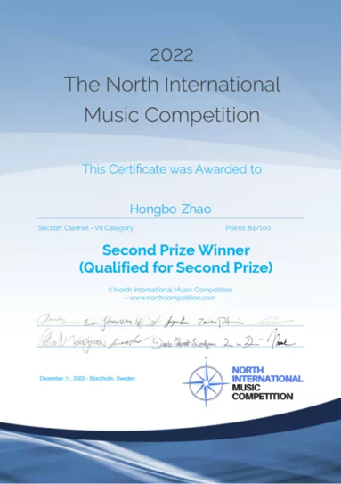 日前,在刚刚结束的第十届瑞典北方国际音乐比赛(The North International Music Competition)中,冰球突破豪华版官方网站2020级本科生赵宏博获得单簧管组二等奖(一等奖空缺)。