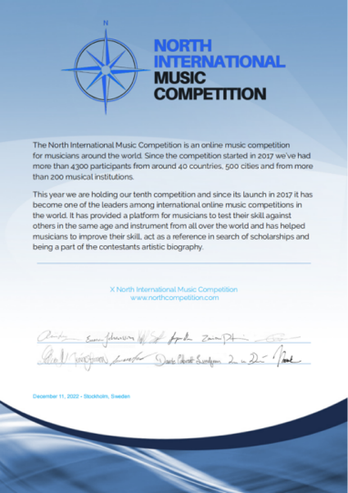瑞典北方国际音乐比赛是一个面向全球音乐家的音乐类专项赛事,自2017年举办以来,已经吸引了来自40多个国家、500多个城市和200多家音乐机构的2800多名选手参赛,该项赛事也逐渐成长为国际音乐比赛的佼佼者之一。本次大赛由瑞典皇家音乐学院教授奥拉斯(Victoria Borisova Ollas)担任评委会主席,大赛评审团主要有来自瑞典皇家音乐学院、挪威音乐学院、瑞典室内乐团等世界一流音乐院校的教授和艺术团体的演奏家,保证了大赛的高艺术水准。