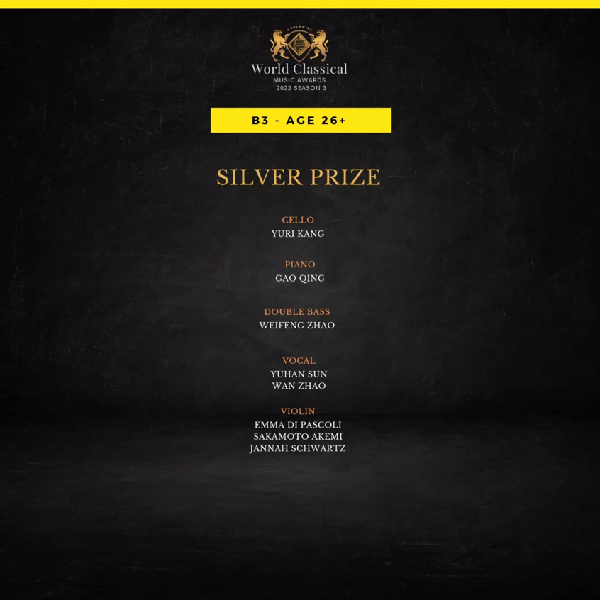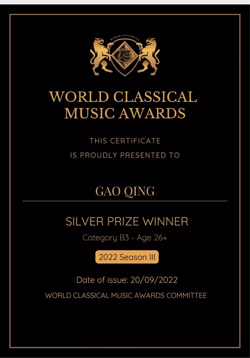 近日,在刚刚结束的2022 World Classical Music Awards (WCMA)中,我院2022级钢琴专业研究生高晴获得银奖。